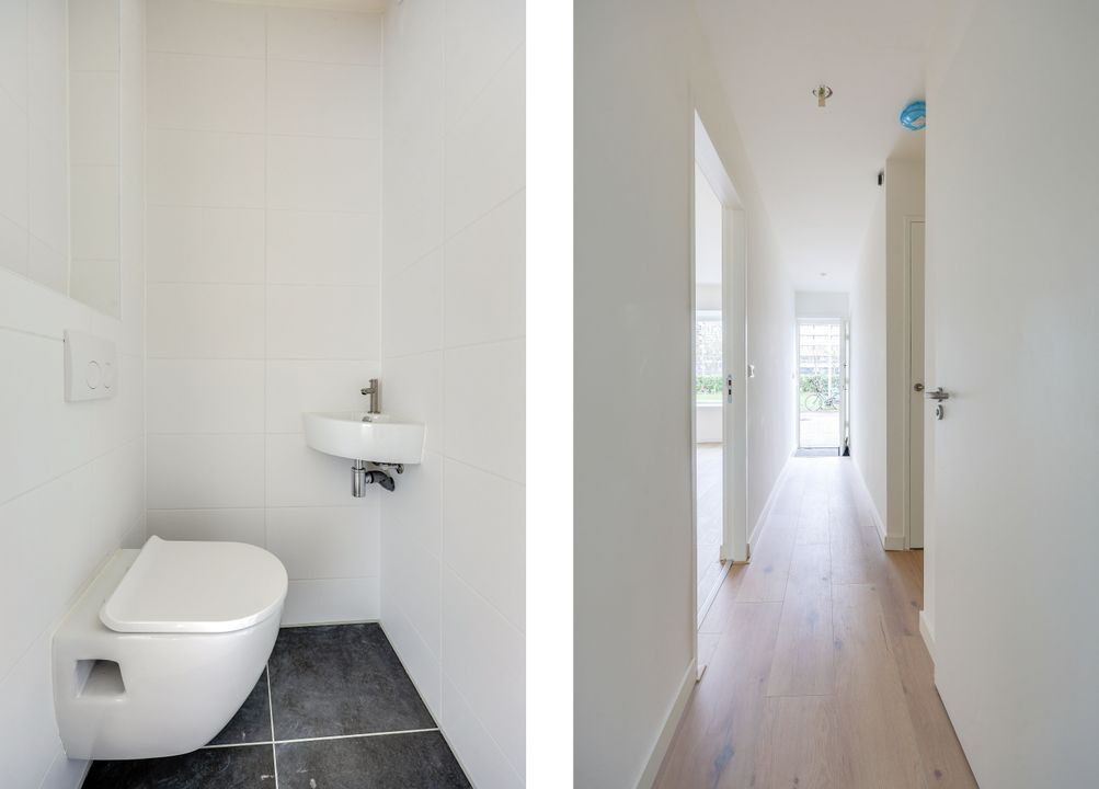 In de gang bevinden zich een separaat toilet, twee slaapkamers, waarvan één met toegang via de openslaande deuren naar de tuin en één met inbouwkast. Een nette badkamer, uitgerust met een inloopdouche, wastafelmeubel en designradiator.